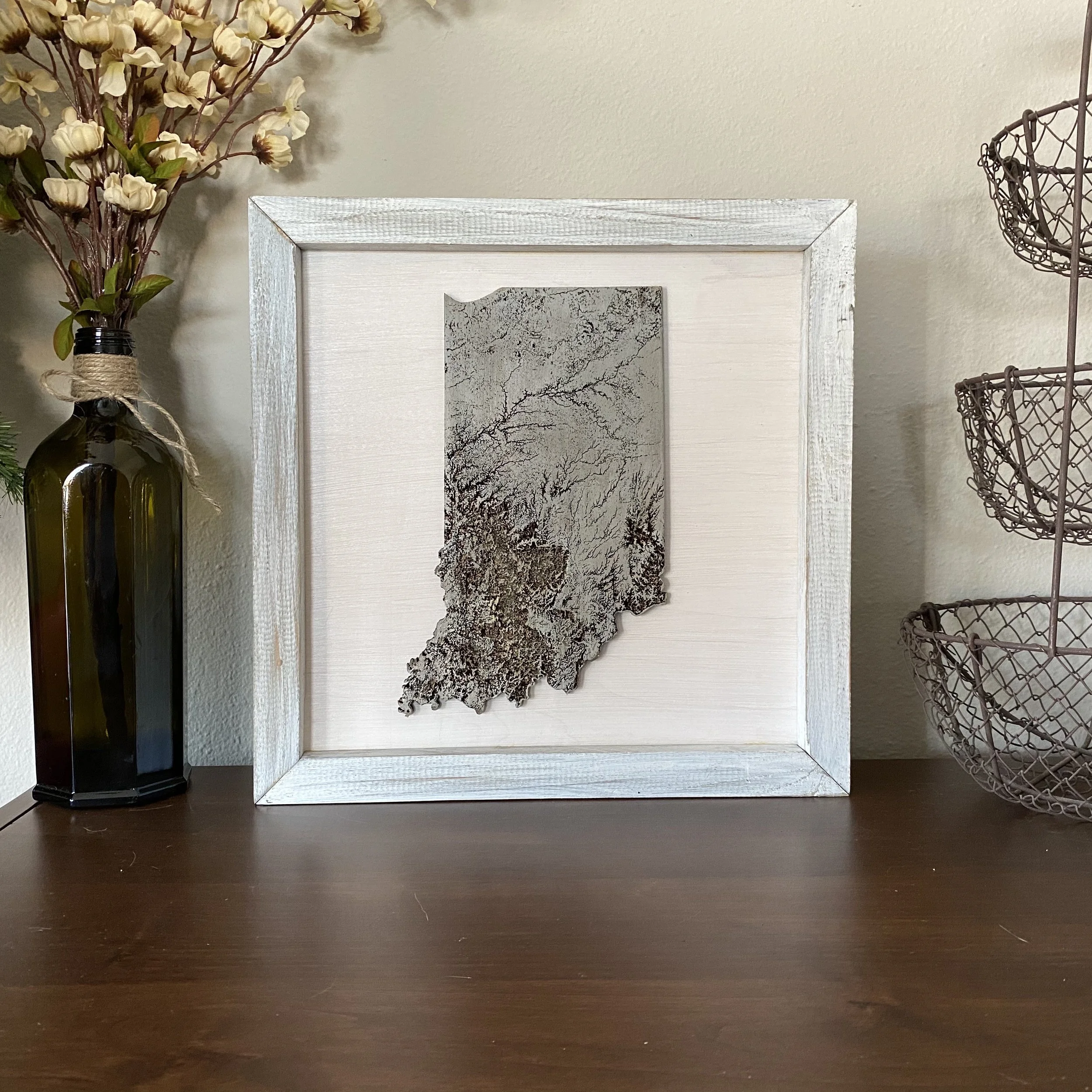 Feel the hills and valleys with our rustic distressed framed topographic states! This listing includes (1) framed topographic state of INDIANA. Measuring 13.5" x 13.5" with a depth of 1"